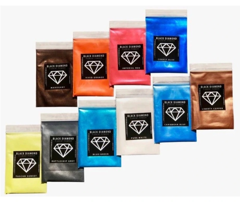 Sada 1 (6659) obsahuje: 1 x 5 g Mahogany Black Diamond Pigment 1 x 5 g Vivid Orange Black Diamond Pigment 1 x 5 g Imperial Red Black Diamond Pigment 1 x 5 g Cobalt Blue Black Diamond Pigment 1 x 5 g Liberty Copper Black Diamond Pigment 1 x 5 g Pure White Black Diamond Pigment 1 x 5 g Caribbean Blue Black Diamond Pigment 1 x 5 g Blue/Green Black Diamond Pigment 1 x 5 g Tuscan Sunset Black Diamond Pigment 1 x 5 g Battleship Grey Black Diamond Pigment