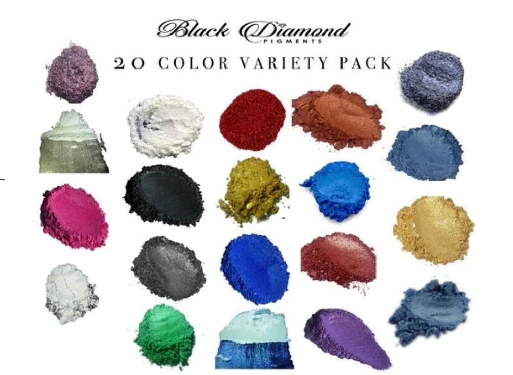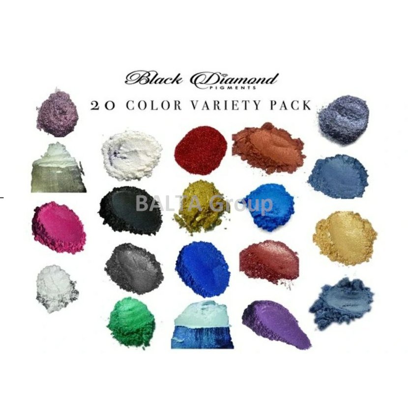 Sada vzorků A od Black Diamond Pigments. Obsahuje 20 barev 5gramových metalických pigmentů – celkem 100 g pigmentů vhodných pro epoxidovou tvorbu. Díky malým mikročásticím slídy o velikosti 10-60 mikrometrů se dobře udržuje ve vznosu, takže méně klesá při odlévání ke dnu. To potom umožňuje vytvářet metalické, perleťové, duhové a jiné efekty a díky tomu si získává oblibu jak u profesionálů, tak i kutilů pro epoxidové lití, výrobu mýdla, svíček, automobilových barev, slizu, šperků, sklolaminátu atd. Vhodný k tónování, ztmavování či zesvětlování jiných metalických pigmentů.