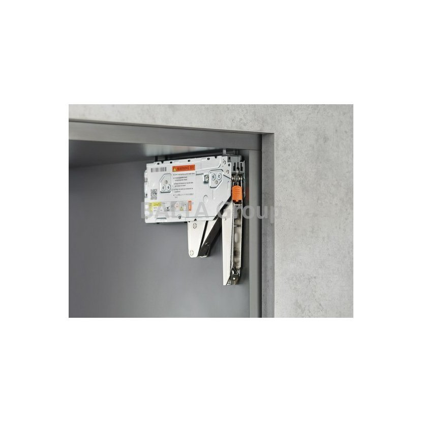 Nová generace výklopného mechanizmu. Montáž tohoto typu zdvihače, osazeného k půdě a přední hraně korpusu, je naprosto přesná. Není vůbec nutné předvrtání otvorů. Nastavení síly zdvihače nově zpředu, seřídíte s veškerým pohodlím, dokonce i s namontovanou krytkou. Omezovač úhlu otevření je již u AVENTOS HK top integrován. To, do jaké výšky se má čelo otevřít, se dá nastavit plynule Sada symetrických zdvihačů s vruty do dřevotřísky, včetně přesného stanovení pozice. Použitelný v rozmezí LF (výška korpusu v mm x hmotnost čela, vč. dvojnásobné hmotnosti úchytky v kg ) - 930 - 2800 Nutno doplnit o krytky, čelní kování, TIP-ON popř. adaptér.