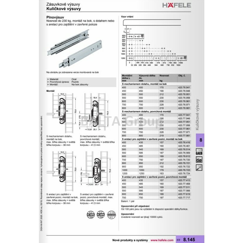 Kuličkové výsuvy, Plnovýsuv, nosnost do 230 kg, ocel S aretací pro zajištění v zavřené poloze, montáž na bok, výsuvná délka: 650 mm, montážní délka: 600 mm, nosnost: 189 kg // dostupnost do týdne