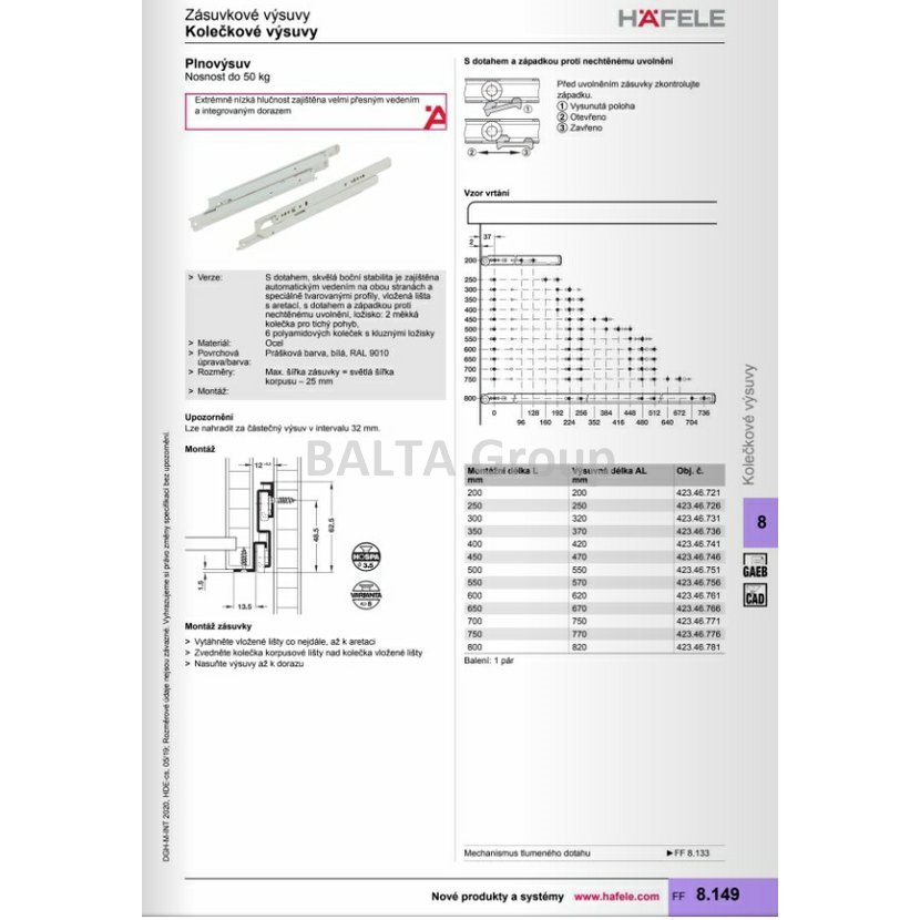 423.46.771 Kolečkové výsuvy, plnovýsuv, nosnost do 50 kg, ocel/700mm