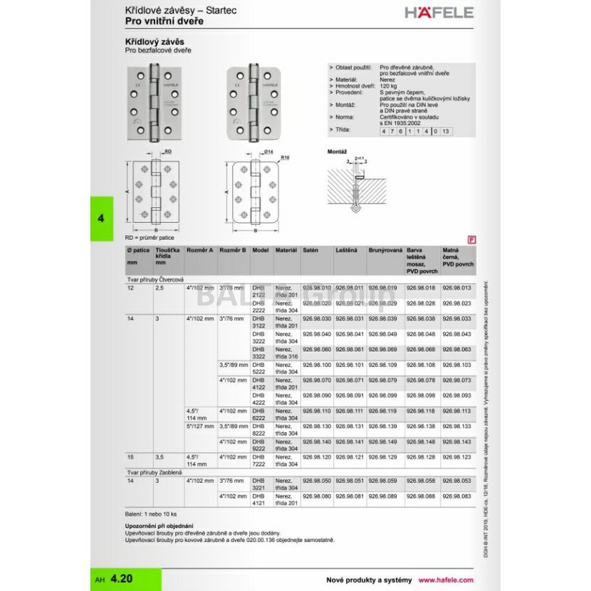 Křídlový závěs, Pro bezfalcové vnitřní dveře do 120 kg, Startec DHB 2122 křídlový závěs, pro křídla bezfalcových dveří, nosnost 80 kg, matná povrchová úprava