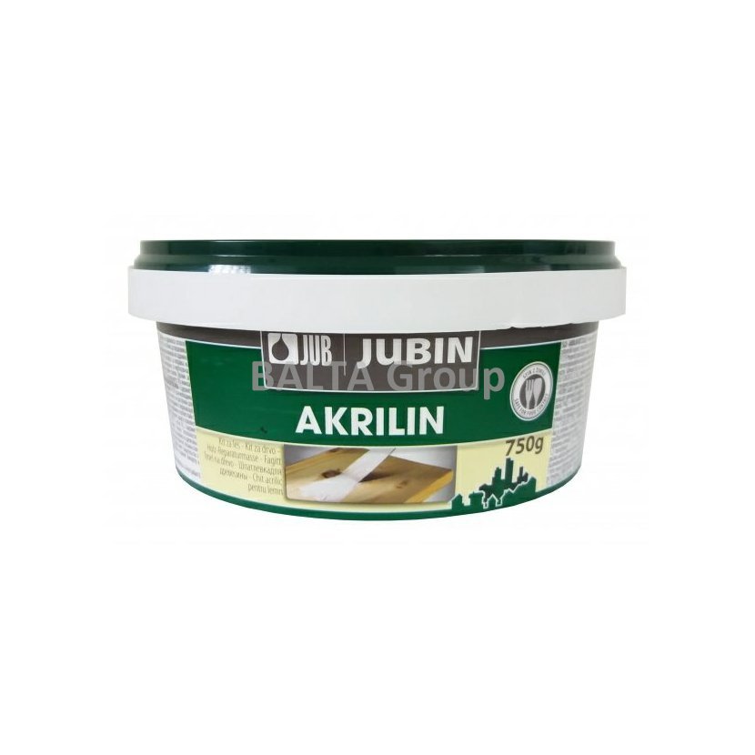 Disperzní vyrovnávací hmota určená pro kvalitní opravy povrchových vad a poškození (prasklin, škrábanců, prohlubní, rýh) na výrobcích z masivního dřeva, z dýhovaných i neupravených dřevotřískových desek, laťovek a překližek před jejich konečnou povrchovou úpravou – jemným broušením, nanášením lazur a jiných nátěrů a lakováním. JUBIN AKRILIN se snadno nanáší, má dobrou přídržnost k podkladu a rychle schne. Z důvodu mimořádně nízkého obsahu nebezpečných látek je JUBIN AKRILIN vhodný i k dekorativním úpravám dětských hraček.