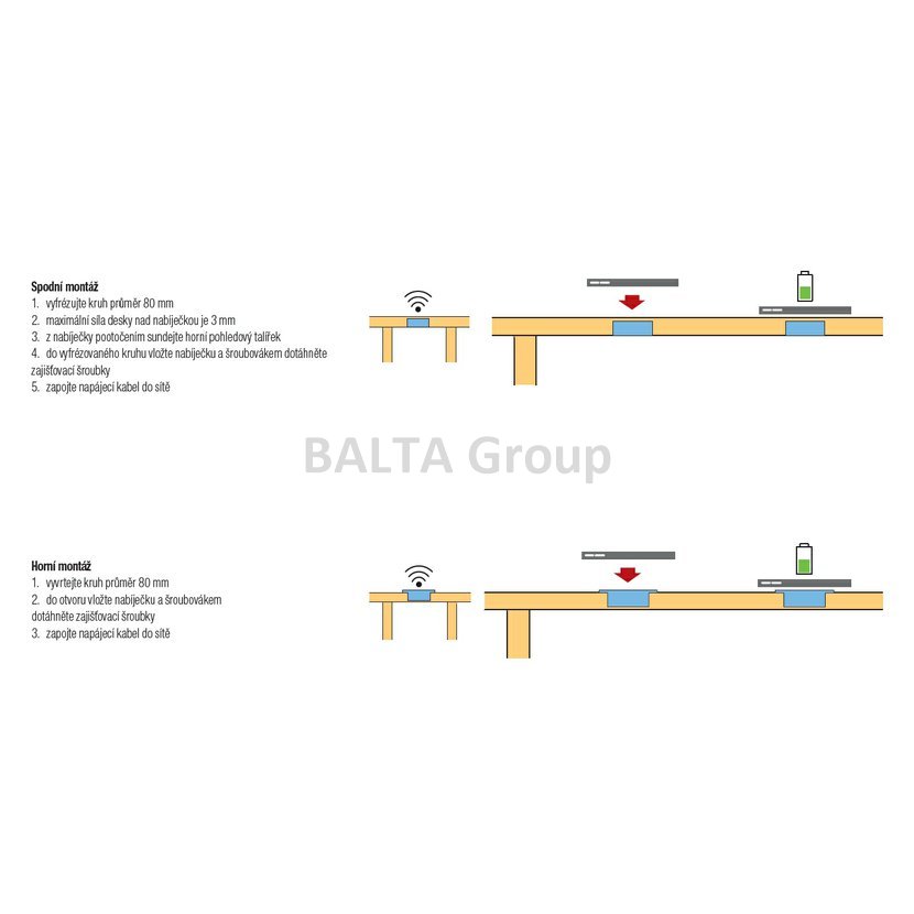 Bezdrátová nabíječka určená k montáži pod desku Qi1001 Bezdrátová nabíječka využívá technologii Qi, kterou musí být vybaven také mobilní telefon Produkt má registrační certifikát QI-ID 2409 Produkt vyhověl testům definovaným ve specifikaci bezdrátového napájení Qi a funguje správně, p