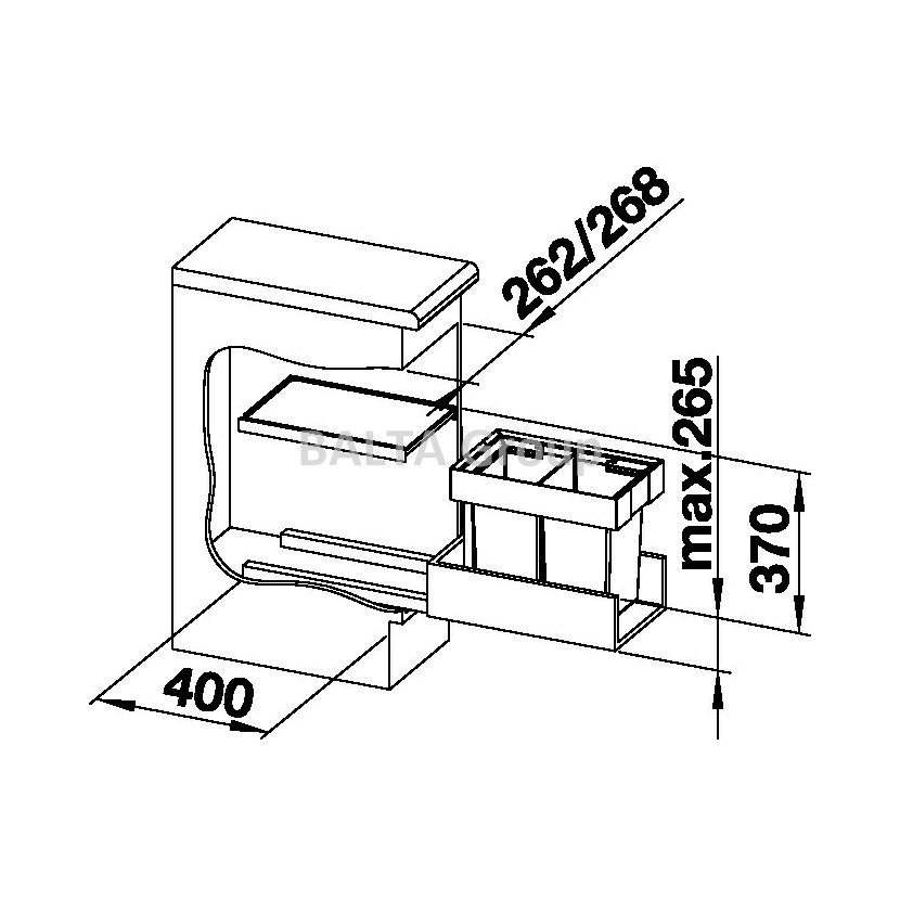 Technické parametry: Je nutná skříňka se zásuvkou. - výška zabudování 370 mm od dna zásuvky, hloubka zabudování 400 mm - maximální výška rámu 265 mm od dna zásuvky - vhodný i pro skříňky s kazetovými dvířky s šířkou rámu od 90 mm - při plánování je třeba zohlednit, v jaké výši je zabudovaný odpad, výšku umístění dna zásuvky, hloubku zabudování dřezu s odtokovou armaturou a z toho vycházející minimální rozměr pro spodní skříňku - minimální doporučená výška soklíku pro zabudování Movex-u: 100 mm
