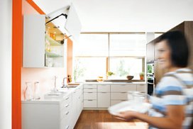 Aventos kování na výklopy přináší skvělý komfort pohybu do prostor horní skříňky. Dokonce široké výklopy se dají otvírat bez sebemenší námahy, zastavit v kterékoli požadované pozici a díky BLUMOTION měkce a tiše zavírat.