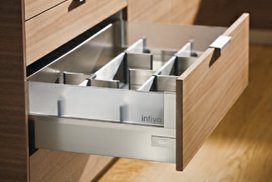 Nábytkové výsuvy od firmy BLUM nabízí pestrou škálu možností: od výsuvů na dřevěné zásuvky až po celé úložné boxy s možností ORGA-LINE pro větší přehlednost.