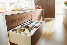 TANDEM - vodící systémy, disponuje plným výsuvem pro dobrý přehled a přímý přístup k uloženým zásobám. Dá se kombinovat s TIP-ON (mechanický způsob otvírání), stejně jako elektrickým způsobem otvírání SERVO-DRIVE.