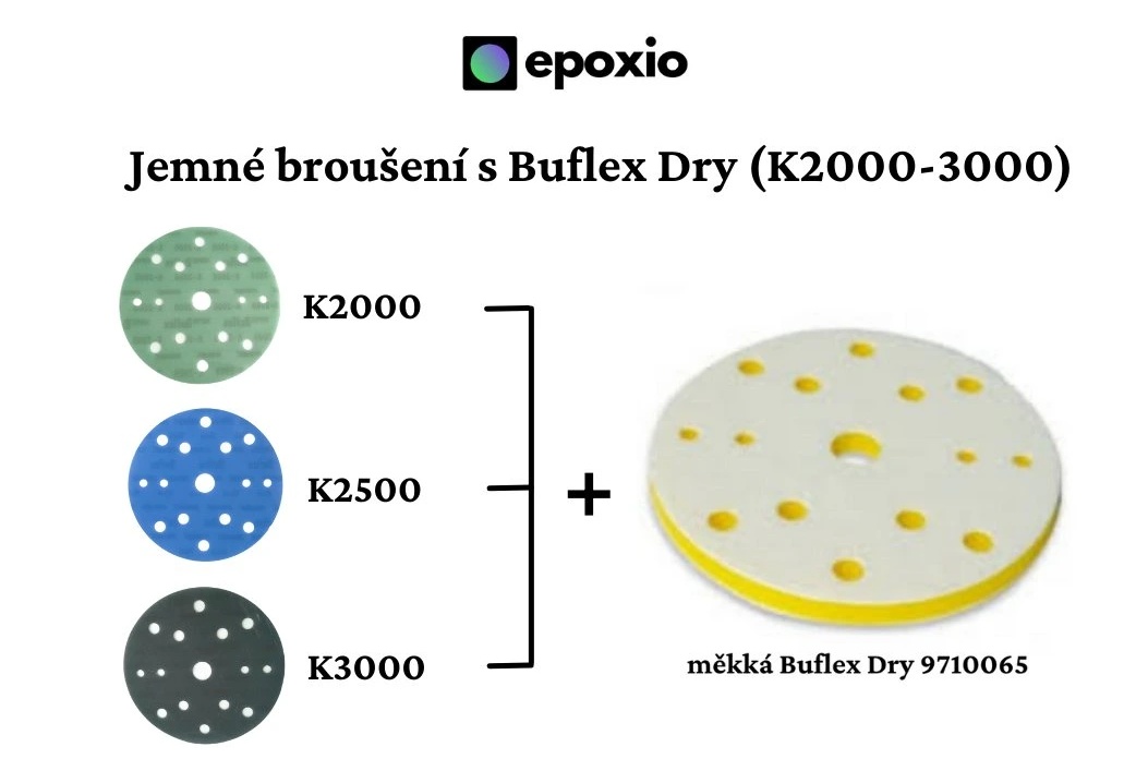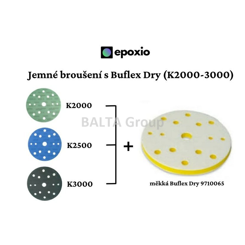 K nejjemnějšímu broušení u zrnitostí K2000, K2500 a K3000 se musí používat Buflex Dry měkká mezivrstva 9710065 se suchým zipem "samice - samice" pro dokonalý výsledek broušení a maximálnímu zkrácení následného leštění. Mezivrstva zamezuje protržení latexového nosiče, dále eliminuje chyby způsobené jemnými náklony brusky při broušení a tím pomáhá sjednocovat směr brusných rýh.