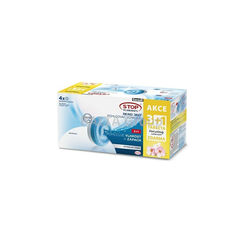 Nové náhradní tablety pro odvlhčovače s ještě vyšším účinkem pohlcování nadměrné vlhkosti. Pohlcují nadměrnou vlhkosti, neutralizují zápach a zároveň osvěží přijemnou relaxační ovocnou vůní. Nadměrná vzdušná vlhkost vytváří příznivé podmínky pro výskyt roztočů a plísní a zvyšuje riziko vzniku alergií. Pohlcovače Ceresit STOP VLHKOSTI AERO 360° pohlcují nadměrnou vzdušnou vlhkost a tím pomáhají zabránit vzniku a růstu plísní, předcházet alergiím, astmatickým projevům, ucpanému nosu, podráždění kůže a ekzémům. Vhodné pro: pohlcovač vlhkosti Ceresit STOP VLHKOSTI AERO 360° použitelné i do staršího typu přístroje