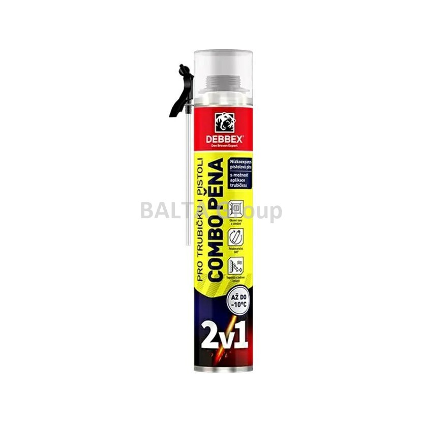 nízkoexpanzní pistolová pěna s možností aplikace trubičkou (2v1) tepelný rozsah použití (od -10 °C až do +35 °C) výborná tepelná a zvuková izolace polohovatelná – možnost aplikace 360° výborná přilnavost na beton, omítku, zdivo, dřevo, polystyren nebo neměkčené PVC apod.