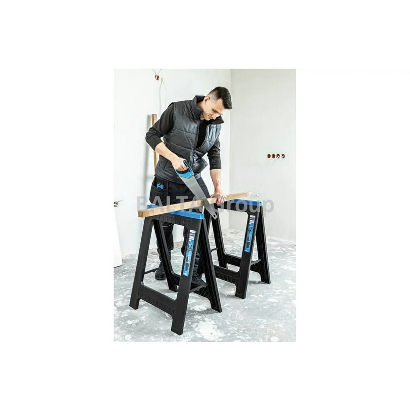Dílenský kozlík HT7G550 vyrobený z plastu usnadňuje mnoho stolařských prací, jako je řezání dřeva a kovu.