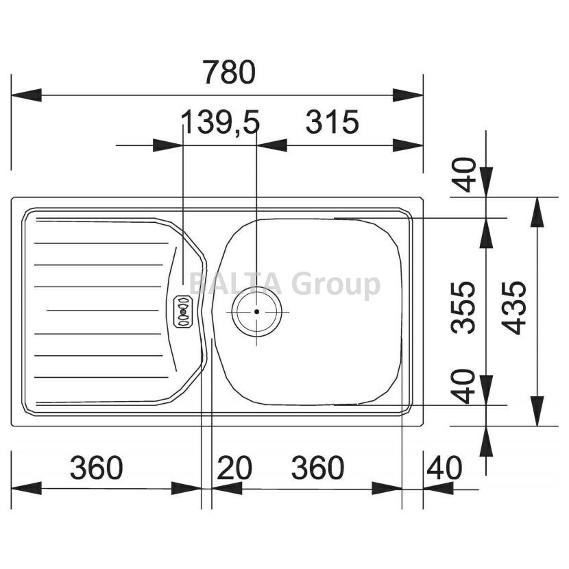 Materiál: Chromniklová ocel Vzhled povrchu: Nerez Rozměr dřezu: 780 x 435 mm Rozměr dřezové nádoby: 360 x 355 x 140 mm Minimální šířka skříňky: 500 mm, po úpravě skříňky i 450 mm Způsob montáže: Horní, dřez je usazen nad pracovní desku Orientace dřezu: Otočný (otvory do dřezu Vám zhotovíme dle přání) Provedení přepadu: Přepad umístěn na odkapové ploše dřezu Rozměr výřezu: 760 x 415 mm