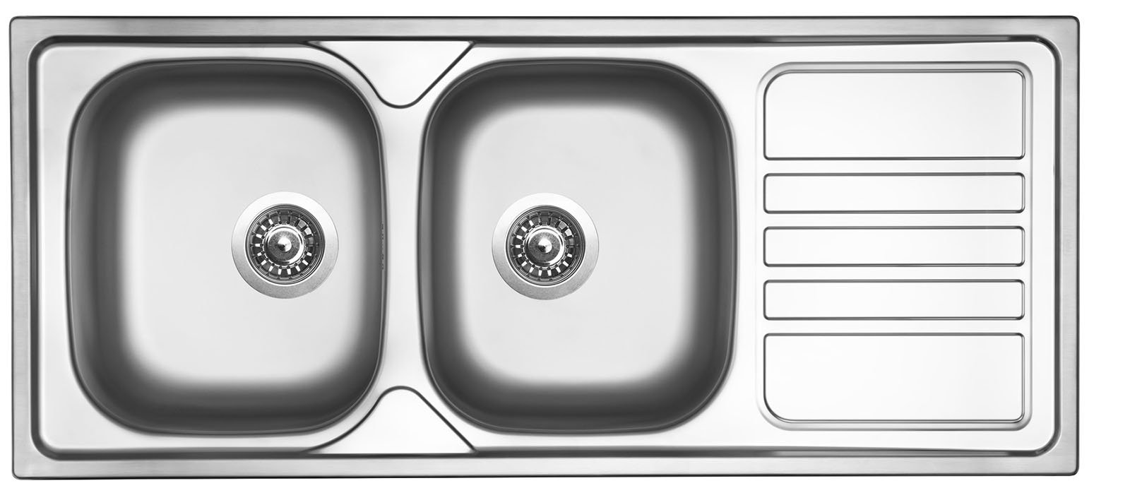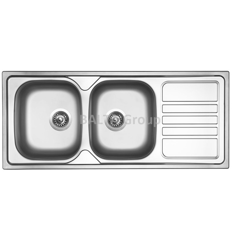 Konstrukční typ Dvoudřezy s odkapem Spodní skříňka 800 mm Vnější rozměry 1160 x 500 mm Rozměry vany 340 x 400 mm (2x) Hloubka dřezu 150 mm Výpust 3 1“ Orientace Otočný Typ montáže Horní Povrch Matný Tloušťka materiálu 0,6 mm Modelová řada Sinks RODI