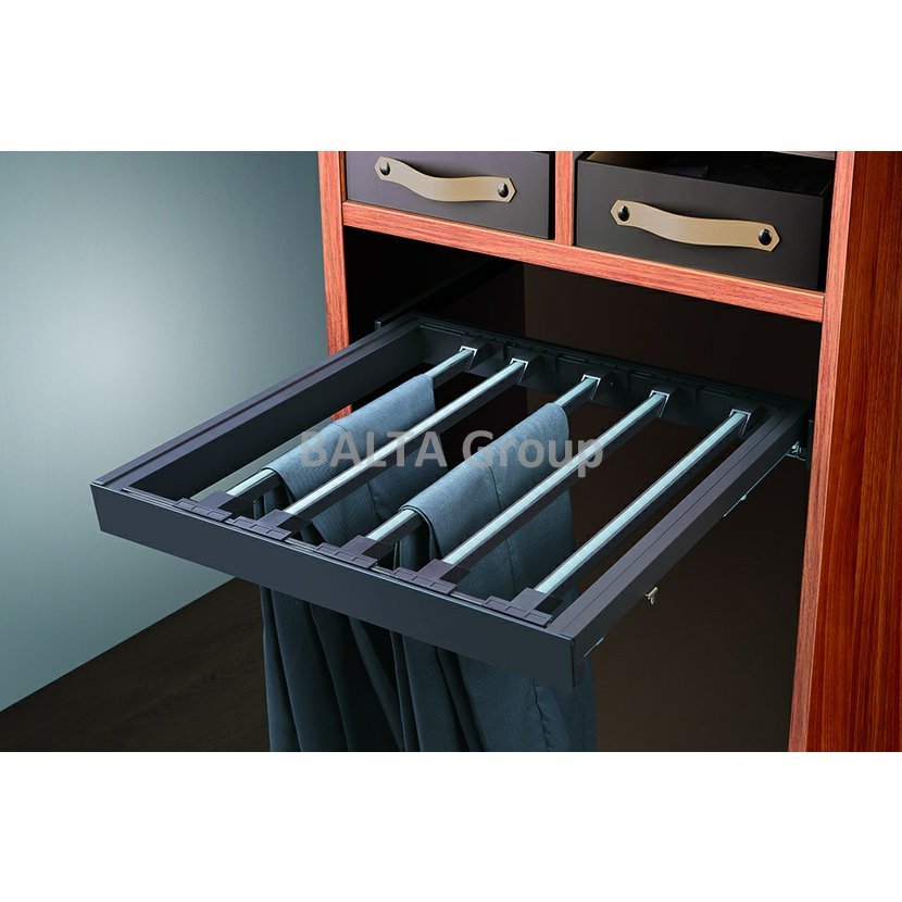 Elegantní, čistý design v módním tmavě hnědém provedení. Pevný rám s pevnými, širokými, přesuvnými relingy opatřené protiskluznou gumou v horní části. Se skrytým výsuvem s integrovaným tlumením. Šířka korpusu - 600 mm. 7 relingů na kalhoty. Chytrý výrobek: díky tmavému odstínu povrchové úpravy nenápadný pomocník. Koše zajišťují přehled a hlavně vzdušnost (uložené prádlo větrá a vydrží déle voňavé). Rozměry ( šířka x hloubka x výška - 564 x 420 x 140 ) Objednat lze výrobek pro korpusy 700, 800, 900mm - v případě zájmu napište do poznámky (cenu ověřit na tel.)