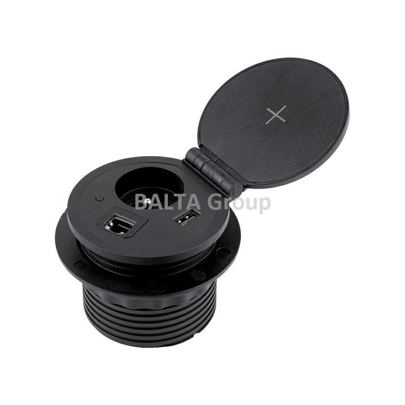 Strong elektrozásuvka otevírací, černá 1 x 230 V francouzský typ s uzemňovacím kolíkem (standard pro CZ a SK), 1 x USB nabíječka 5V, 2,4A, 1 x RJ45,bezdrátová nabíječka Napájecí kabel 2 m Průměr vrtání 80 mm Součástí balení je keystone HDMI, který je možno jednoduše vyměnit místo RJ45
