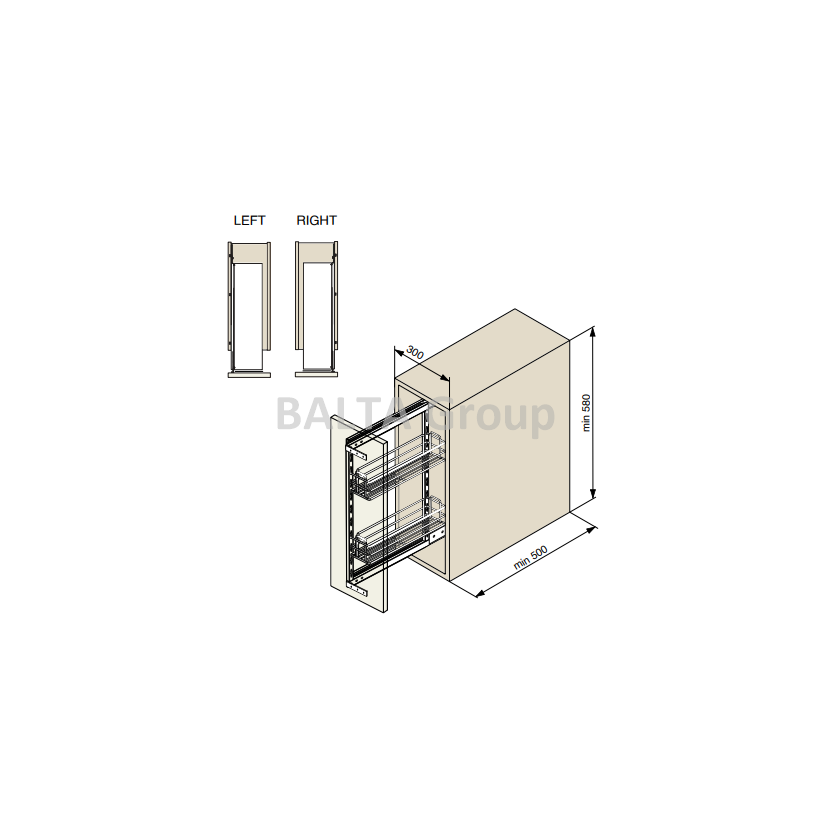 Výsuvné koše s bočním rámem na kuličkových výsuvech s tlumeným dotahem. Pozici obou košů lze měnit mezi otvory na rámu. Koše jsou z chromovaného drátu, rám je ocelový s šedým lakem.