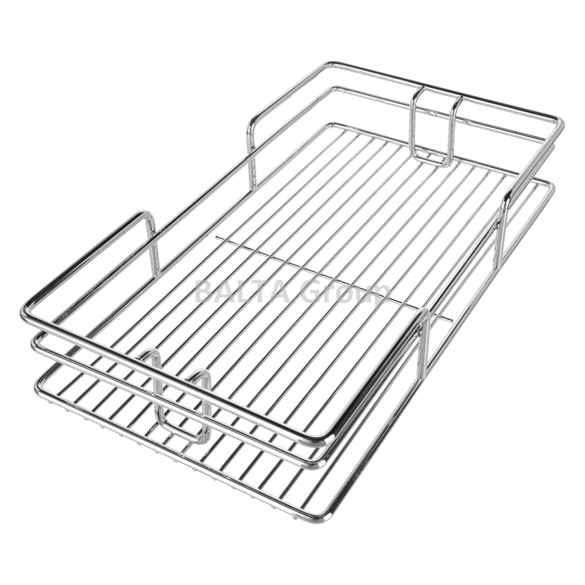 Drátěný chromovaný koš do potravinové skříně . Koše se vkládají do rámu potravinové skříně , který se kupuje zvlášť. Košů je možno koupit libovolné množství. Šíře koše je vztažená k vnější šířce korpusu, do kterého se skříň namontuje.