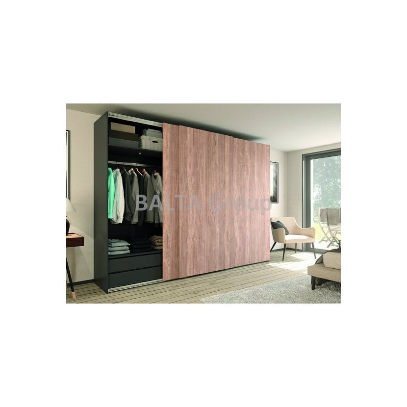 Kompletní sada kování pro troje dveře včetně horního a spodního vedení, tlumičů ve směru zavírání i otevírání včetně antikolize. Maximální šířka skříně bez bočních stěn - 4000mm. Pro tloušťku materiálu 18 - 30mm. Hmotnost jednoho křídla - 20 - 50 kg. Maximální výška křídla - 2600mm, záleží ovšem na šířce křídla viz. montážní návod