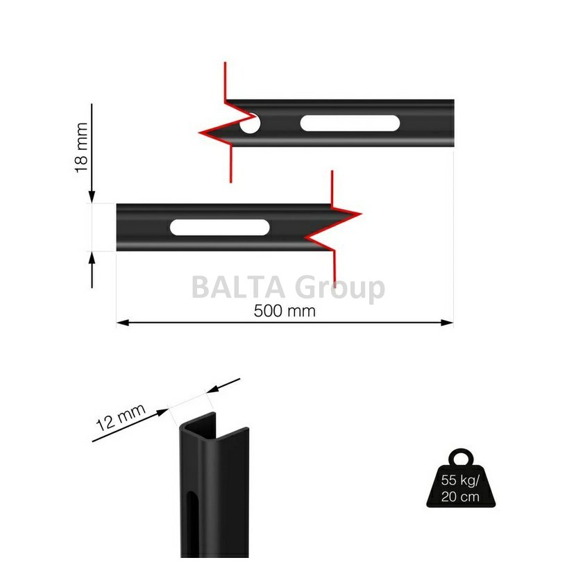 Jednořadá nástěnná lišta je základním prvkem regálového systému s roztečí děr 50 mm. Je určena především pro uchycení základních a stranových nosníků, ale i pro nosníky šatních tyčí, nosníky dřevěných polic a perforované zadní stěny.