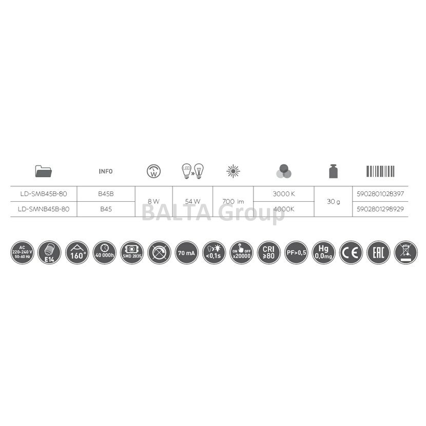 LED žárovka B45, SMD 2835, 4000K,E14, 8W, AC220-240V, 160°, 700lm, 70mA