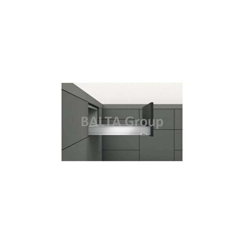 V případě požadavku na bezúchytkové otevírání s tlumeným dotahem Tip-on Blumotion (TOB) nutno podle celkové hmotnosti zásuvky s obsahem doplnit modul a synchronizační hřídel . Délka hřídele je 1125mm a bez krácení lze použít na korpus vnější šířky až 1400mm.