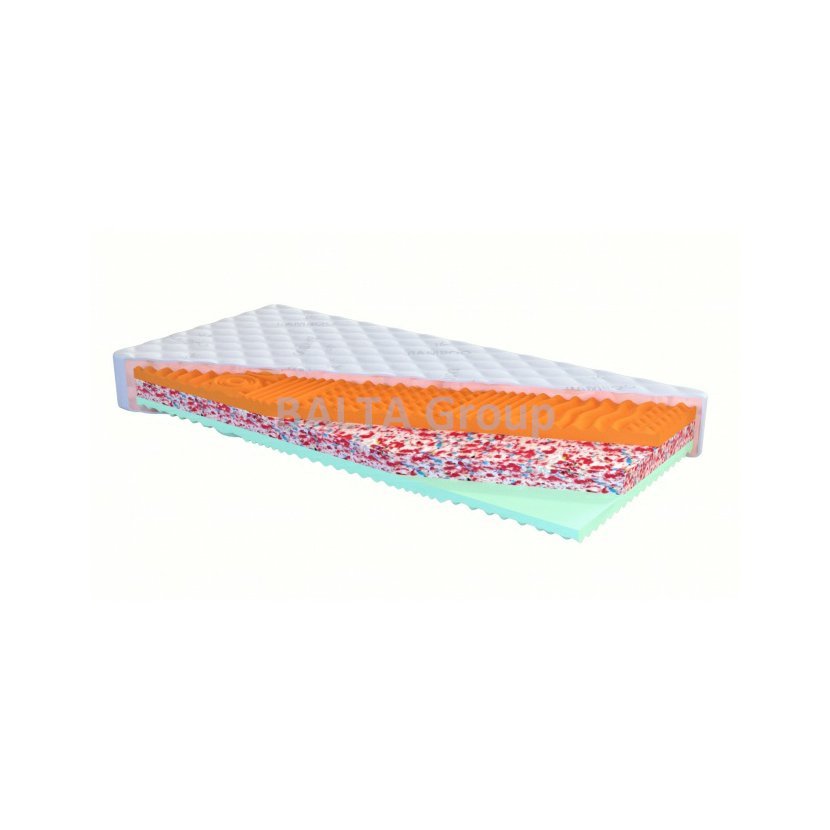 Oboustranná sendvičová sedmizónová matrace v kombinaci paměťové pěny a pojené polyuretanové pěny R80. Materiál potahu ALOE VERA prošitý polyesterovým rounem z dutého vlákna. Možnost výběru potahu: Standard, Silver, Bambus, Bavlna - vlna. Materiál jádra Střední vrstva je vyrobena z pojené polyuretanové pěny typu R80. Zelená a oranžová strana je vyrobena z paměťové pěny o hustotě 42 kg/m3 s masážním profilem rozděleným do sedmi zón. Tvrdost T3 - T4 střední až vyšší Výška 17cm Zatížení do 130kg Praní potahu do 40°C prodyšnost matrace střední Umístění matrace lamelový rošt, laťový rošt, pevná deska Hmotnost matrace 200x90cm - 16kg Přizpůsobení matrace Zhotovíme libovolné rozměry a tvary matrace Potah lze zhotovit z potahové látky Ano - Vybrat potahový materiál