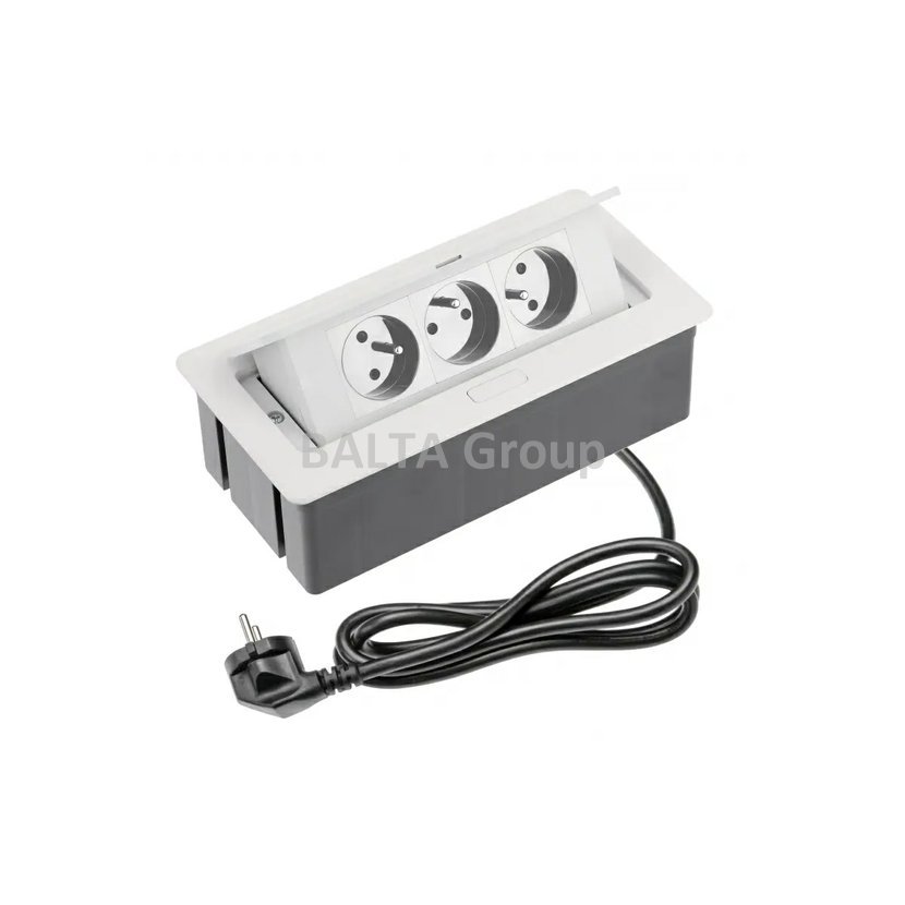 Výsuvný set 3 zásuvek, který se montuje do pracovního stolu nebo do pracovní desky kuchyňské linky. Součástí produktu je přívodní kabel o délce 1,5 m. Zásuvky jsou zde standardního typu, tzn. se zemnícím kolíkem. Výrobce: GTV šířka: 12 cm hloubka: 8 cm délka: 24 cm napětí: 230 V materiál: kov, plast max. výkon: 3600 W stupeň krytí: IP 20