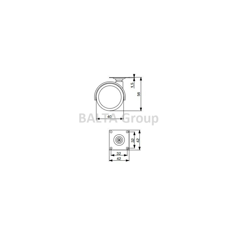 Nábytkové kolečko D40, plotnička 42x42x1,5 mm, měkčený běhoun, černá