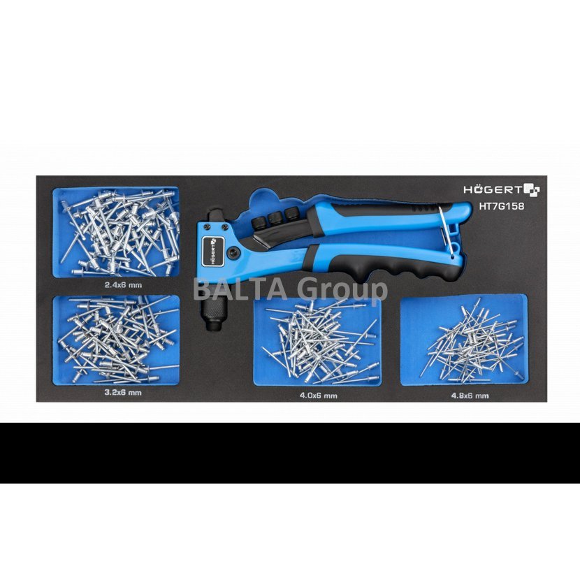 . ruční nýtovačka se 4 hlavami na ocelové a hliníkové trhací nýty; . hliníkové nýty ve 4 velikostech; . technická pěna EVA umožňuje udržovat na pracovišti pořádek a zajišťuje snadný a pohodlný přístup k často používaným nástrojům.