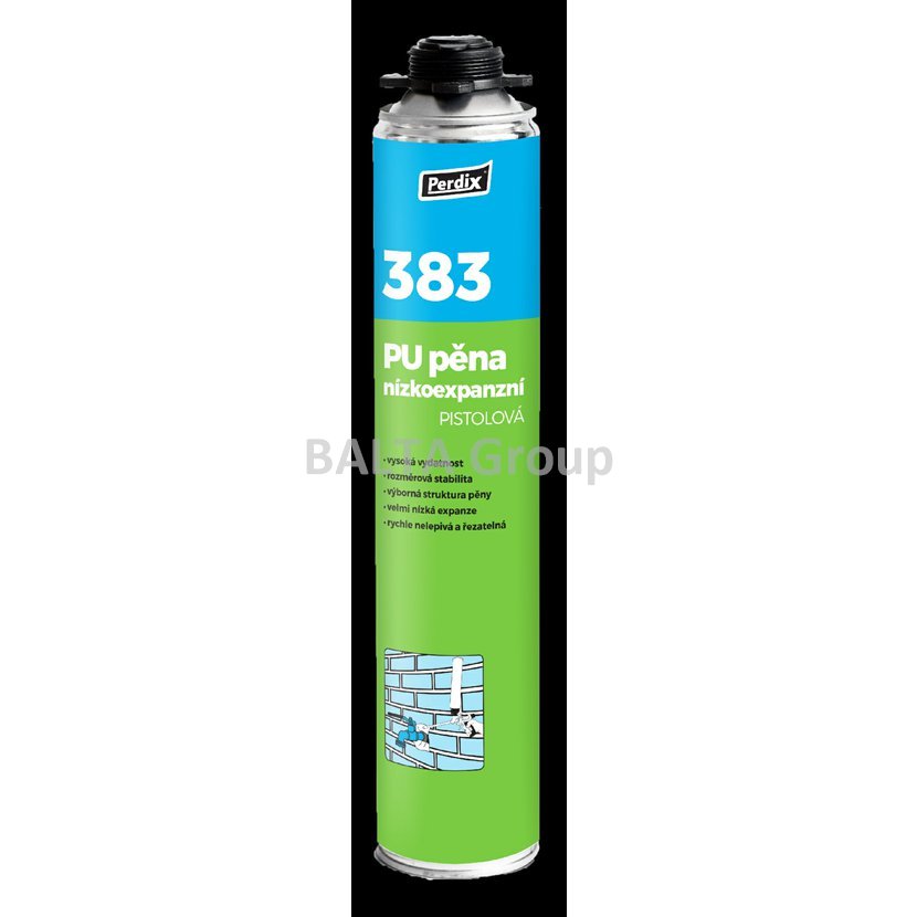 Perdix – 383 PU pěna nízkoexpanzní je montážní a těsnicí polyuretanová hmota vznikající napěněním a vytvrzením kapalné směsi vlivem vzdušné vlhkosti. Je určena pro aplikace s požadavkem na nižší expanzi vytvrzené pěny a případné lepení různých stavebních materiálů. Vlastnosti a oblasti použití