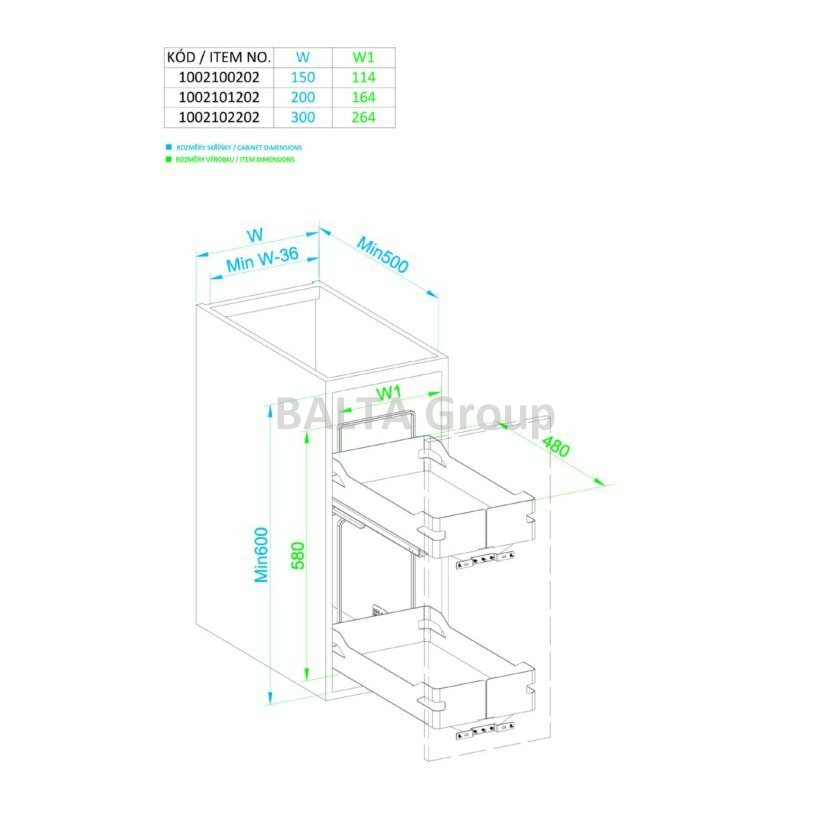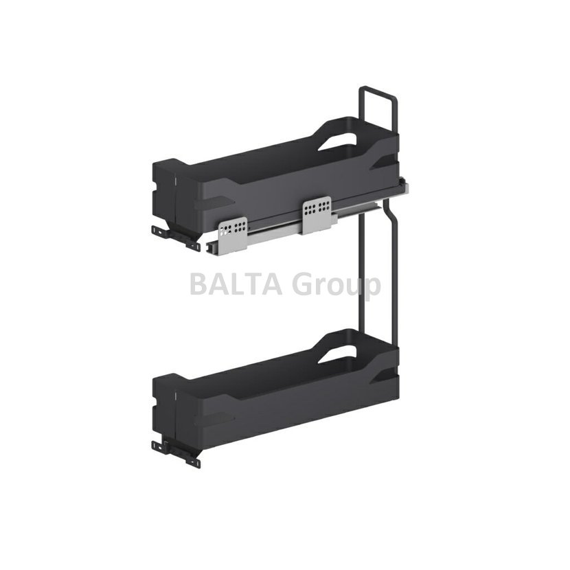 Plnovýsuvný koš WIRELI Style s bočním vedením představuje moderní a technicky vyspělý úložný systém, navržený pro spodní kuchyňské skříňky o šířce 150 mm. Díky své štíhlé konstrukci a dvoupatrovému provedení umožňuje maximální využití úzkého prostoru, který by jinak zůstal nevyužitý.