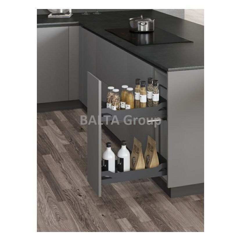 Koše z řady Style mají protiskluzovou vrstvu, která brání pohybu lahví a obalů během manipulace - což je zásadní pro bezpečné uložení sklenic, olejů nebo koření. Moderní, geometricky čisté linie, subtilní boční rámečky a matná antracitová povrchová úprava ladí s aktuálními trendy v kuchyňském designu.