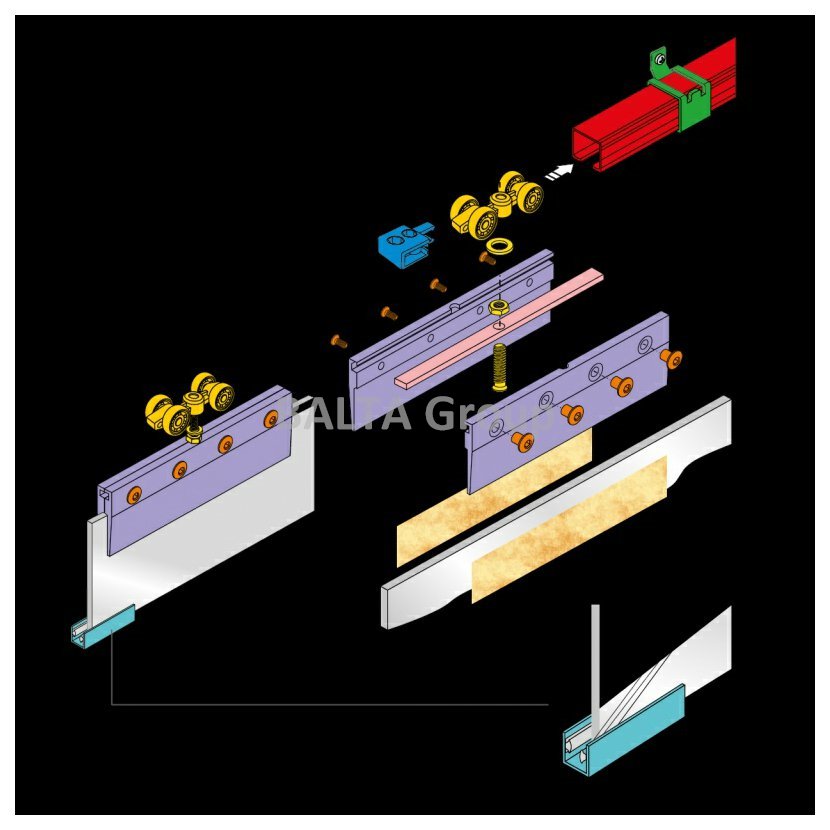 Sada kování PORTA GLASS pro systém posuvného kování pro skleněné interiérové dveře otevírané synchronně na dvě strany s maximální hmotností do 50Kg. Při použití skleněné výplně mají dveřní křídla tloušťku 8mm. Vozíky jsou vybaveny kuličkovými ložisky, které zajišťují tichý chod a dlouhou životnost.