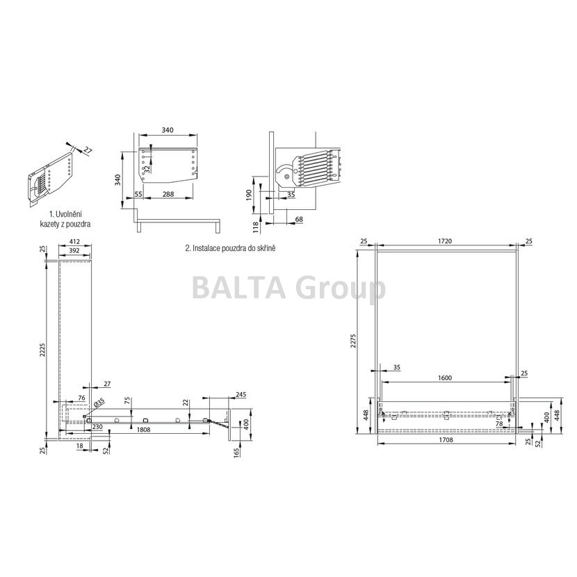 Kování KP09 s povrchovou úpravou práškovým lakováním je vhodné pro konstrukci válend a lůžek sklápěných do skříní (min. hloubka korpusu 412mm) při řešení nedostatku prostoru v obytných místnostech. Součástí dodávky je pouze otočný mechanizmus do skříně, bez řešení podpůrné nohy - lze použít závěsy 392591 a plynovou vzpěru 275672. Maximální hmotnost konstrukce lůžka - tj. rám lůžka, rošt, matrace a lůžkoviny kurtované k lůžku - nesmí přesáhnout 55kg, tedy není vhodné pro zvedání širší postele než 140cm. Při překročení této hmotnosti nelze garantovat správný chod mechanismu. Nosnost sklopené postele je závislá na spojovacím materiálu použitém pro montáž kování na rám lůžka a korpus skříně. Pro spojení kování s rámem lůžka je nutno z vnitřní strany rámu použít narážecí matice M6 a šrouby s metrickým závitem M6 s délkou závitu = tloušťka bočnice rámu postele + 3mm. Pro spojení kování s korpusem skříně je nutno z vnitřní strany korpusu použít závrtné matice M6 a šrouby s metrickým závitem M6 s maximální možnou délkou závitu. Alternativně je možno použít eurošrouby s maximální možnou délkou.