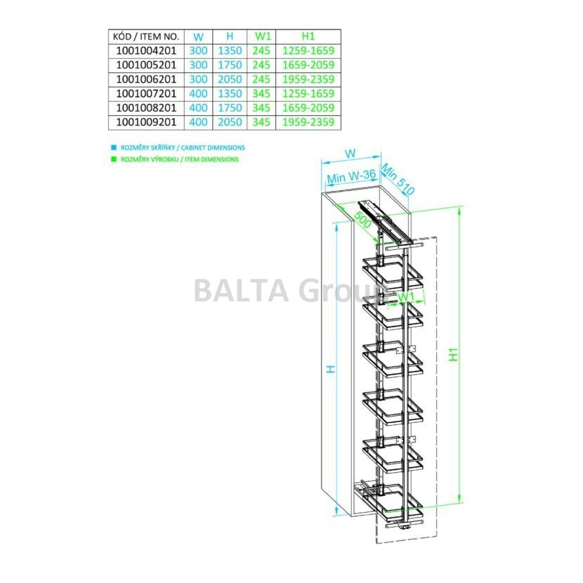 Potravinová skříň WIRELI Elegance 4 koše 300mm, 245x500x1259-1655mm, bílá,chrom(1001004201