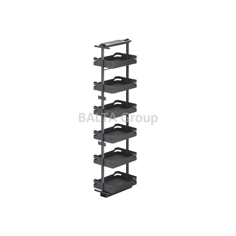 Jednotlivé koše jsou opatřeny protiskluzovým povrchem, který zabraňuje pohybu uložených lahví, balení a dóz. Elegantní antracitová povrchová úprava, subtilní rámečky a geometricky čistý design skříň perfektně sladí s moderním kuchyňským nábytkem.