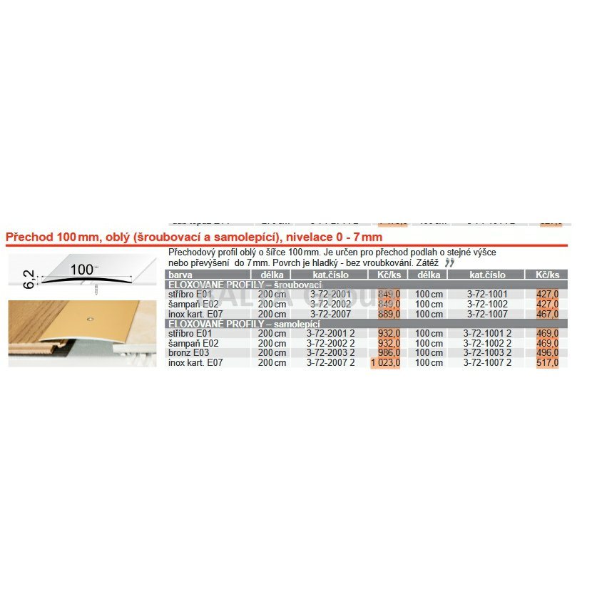 Hliníkový profil šroubovací nebo nevrtaný, určený pro přechody podlah s maximálním převýšením 12 mm. Profil je hladký a vyrábí se v eloxovaném provedení. Nevrtaný profil určený k přilepení neobsahuje samolepící proužky a lepí se doporučenými lepidly.