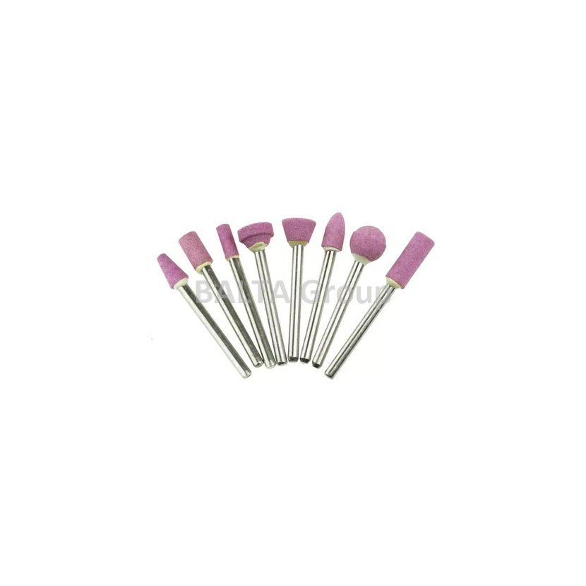 Sada 8 kusů pro mini brusky, přesné ruční brusky. Sada obsahuje 8 brusných kamenů různých tvarů. Umožňují přesné obrábění malých předmětů a povrchů. Brusné kameny jsou připevněny k trnu o průměru 3,2 mm. Sada doporučená pro brusky DEDRA DED7946Z1, DED7944Z2, DED6903.