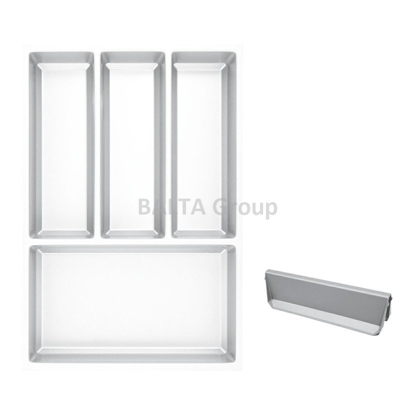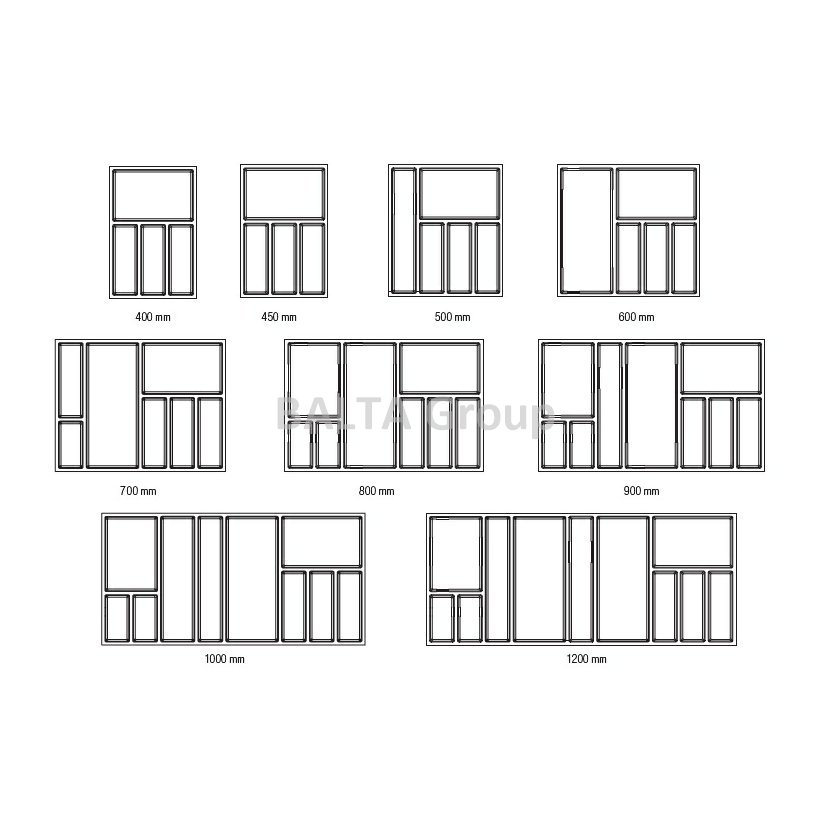 Vložka příborníku SKY pro různé typy zásuvek. Kombinace pevných přihrádek a pohyblivých přepážek (k dokoupení zvlášť). Pro různé typy zásuvkových systémů - StrongMax, Legrabox, nebo i jiné typy (možno zúžit a zkrátit). Barva antracit. Chytrý výrobek: Příborníky jsou rozměrem připraveny pro zásuvky s tenkými bočnicemi (StrongMax, Blum Legrabox). V rozměrech od 40 do 1200 mm šířy skříňky. Lze je vzájemně kombinovat a spojovat (spojovací profil). K bočnici přilehnou přesně díky ukončovacímu profilu. Je tu i možnost doplnit o držák nožů, řezačku folii a také o další posuvná dělítka pro personalizaci podle přání zákazníka. (barva bílá + 1 dělítko)