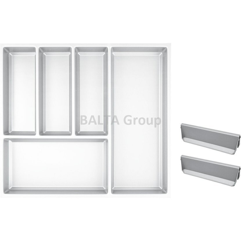 Vložka příborníku SKY pro různé typy zásuvek. Kombinace pevných přihrádek a pohyblivých přepážek (k dokoupení zvlášť). Pro různé typy zásuvkových systémů - StrongMax, Legrabox, nebo i jiné typy (možno zúžit a zkrátit). Barva antracit. Chytrý výrobek: Příborníky jsou rozměrem připraveny pro zásuvky s tenkými bočnicemi (StrongMax, Blum Legrabox). V rozměrech od 40 do 1200 mm šířy skříňky. Lze je vzájemně kombinovat a spojovat (spojovací profil). K bočnici přilehnou přesně díky ukončovacímu profilu. Je tu i možnost doplnit o držák nožů, řezačku folii a také o další posuvná dělítka pro personalizaci podle přání zákazníka.(barva BÍLÁ + 2 dělítka)