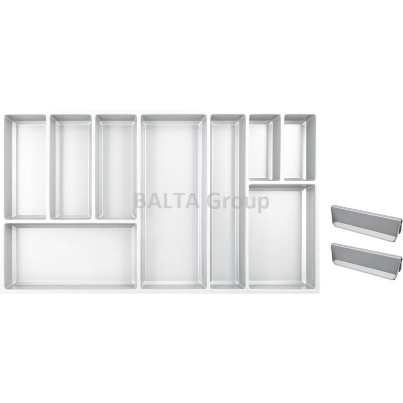 Vložka příborníku SKY pro různé typy zásuvek. Kombinace pevných přihrádek a pohyblivých přepážek (k dokoupení zvlášť). Pro různé typy zásuvkových systémů - StrongMax, Legrabox, nebo i jiné typy (možno zúžit a zkrátit). Barva antracit. Chytrý výrobek: Příborníky jsou rozměrem připraveny pro zásuvky s tenkými bočnicemi (StrongMax, Blum Legrabox). V rozměrech od 40 do 1200 mm šířy skříňky. Lze je vzájemně kombinovat a spojovat (spojovací profil). K bočnici přilehnou přesně díky ukončovacímu profilu. Je tu i možnost doplnit o držák nožů, řezačku folii a také o další posuvná dělítka pro personalizaci podle přání zákazníka. ( barva BÍLÁ +2 dělítka)