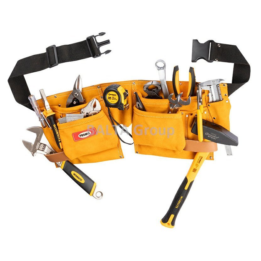 Vyroben z kvalitní kůže. Nastavitelný pásek. Různé kapsy na materiál a nářadí.