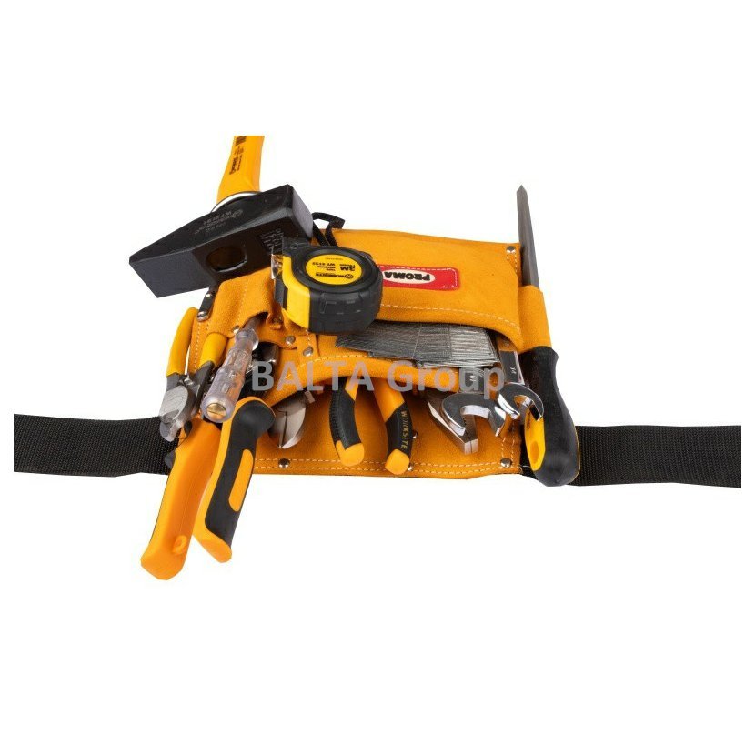 Nářaďový pás Proma RPI-415 je spolehlivým parťákem jak pro profesionální řemeslníky, tak pro domácí kutily. Je navržen tak, aby usnadnil organizaci vašeho nářadí, pomůcek a drobného příslušenství, jako jsou hřebíky a šrouby. Díky široké škále kapes na drobný materiál a praktickým poutkům pro kladiva a podobné nástroje máte vše důležité neustále po ruce. Tento pás je vyroben z kvalitní kůže, což zajišťuje odolnost a dlouhou životnost. Jeho pohodlné nošení kolem pasu je zajištěno nastavitelným opaskem, který se přizpůsobí vašim potřebám. S koženým nářaďovým pásem Proma RPI-415 bude manipulace s nářadím jednodušší a efektivnější než kdy dříve. Vyroben z kvalitní kůže. Nastavitelný pásek. Různé kapsy na materiál a nářadí.