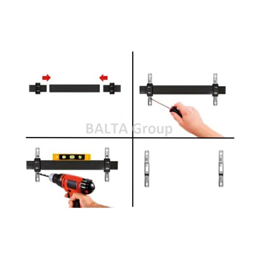 Dle potřebné šířky, lze upravit středový profil, následně po zasunutí pouzdra, do kterého se také umístí závěsný plech. Umístíme tuto sestavu do roviny přiložením vodováhy a následně jednoduše označíme pozice pro otvory.