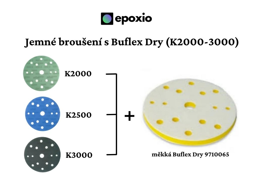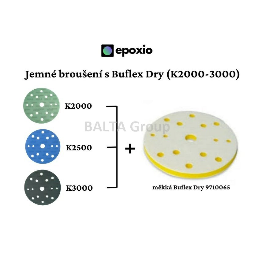 Při broušení brusivem Buflex Dry zrnitosti K2000, K2500 a K3000 se musí používat super měkká mezivrstva 9710065, aby nedošlo k protržení brusných papírů háčky suchého zipu na brusce a aby tyto háčky pak neškrabaly broušený povrch.
