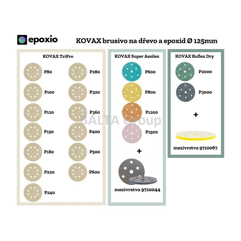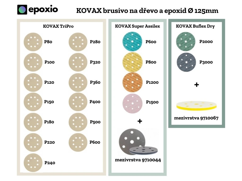 Sada brusných kotoučů KOVAX o průměru 125 mm se 7-8 otvory v zrnitostech K80-K3000 pro hrubé, střední až jemné broušení dřeva a epoxidu za sucha. Obsahuje 19ks kotoučů a 2 mezivrstvy.