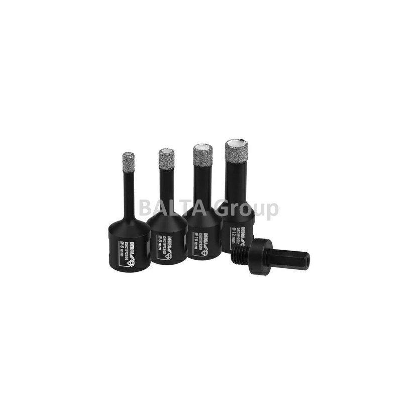Sada 4 diamantových vrtáků Vacuum Braze d pro vrtání do keramických dlaždic, porcelánové kameniny, betonu, cihel, skla, asfaltu, laminátů, PVC, oceli, neželezných kovů, dřeva atd. Technologie Vacuum Brazed zaručuje čisté a pevné spojení mentolových zrn s matricí a tělem. Absence pájených nebo laserem svařovaných prvků (diamantových segmentů), které se mohou během práce oddělit od jádra, zajišťujeb ez p ečno u práci s nástrojem. ZávitM14 umožňuje montáž jádrové frézy na jakoukoli úhlovou brusku. Jádrové frézy VB lze použít pro mokré i suché aplikace. Součástí dodávkyje adaptér M14 na HEX, který umožňuje použití diagonálních fréz s vrtačkami.