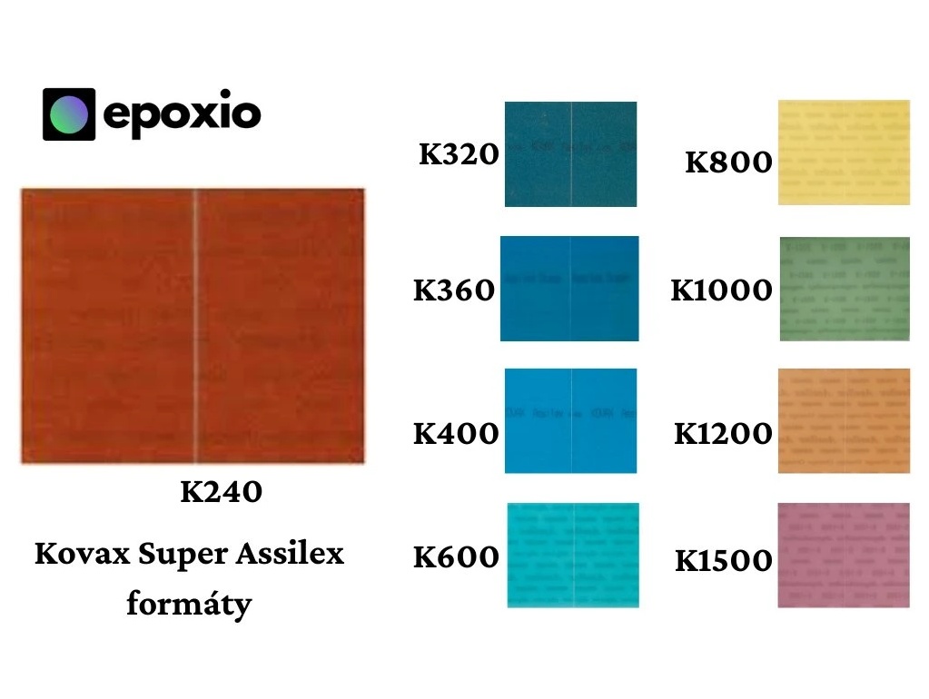 Sada brusných formátů SUPER ASSILEX pro efektivní a rychlé ruční broušení dřeva a epoxidu od zrnitosti 240 do 1500 bez mezivrstev. Obsahuje 8 ks formátů o rozměrech 130 x 170 mm s perforací pro snadné rozdělení na 2 formáty 130 x 85 mm. Obsahuje 8 ks formátů o zrnitostech: 240, 320, 400, 600, 800, 1000, 1200, 1500. Formát 360 není nutné použít, proto ho do sady nezařazujeme. Jedinečná struktura zrn brusiva Super Assilex je fixována na patentovaném nosiči z latexu umožňující jednotné mělké brusné rýhy ve stejném směru a tím předchází problémům při broušení v dalších krocích. Umožňuje vysokou kontrolu při broušení a tím šetří čas až o 50 %.