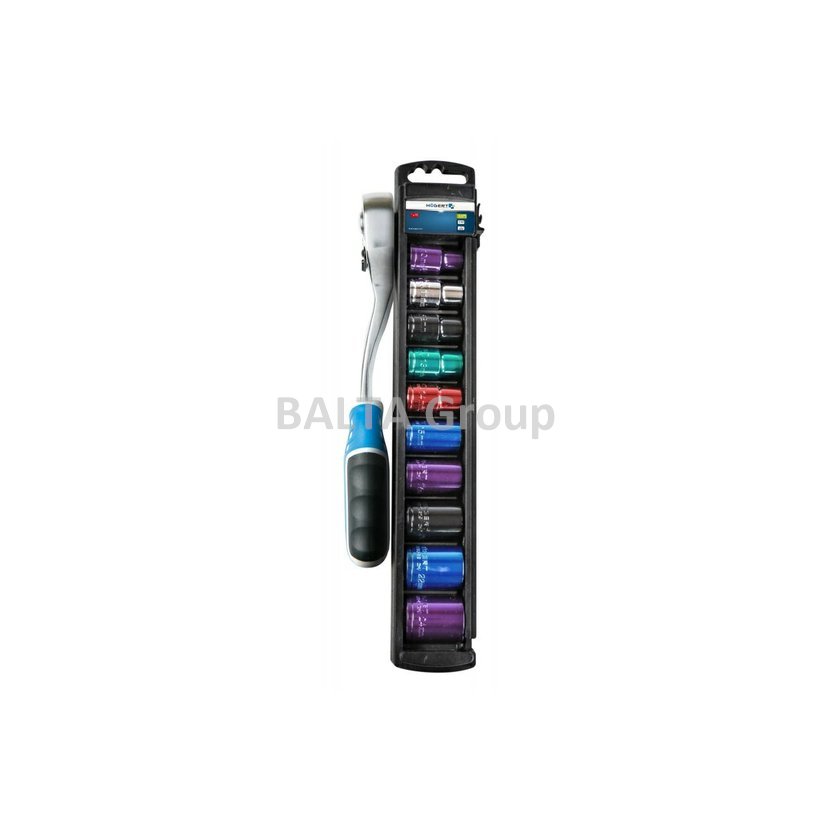 výstupní pohon 1/2” tělo z chrom-vanadiové legované oceli přesný ráčnový mechanismus vyrobený z vysoce kvalitní chrom-molybdenové oceli ráčnový mechanismus se 72 zuby Pracovní úhel 5° pravý / levý přepínač Zásuvkový zámek s mechanismem pro uvolnění zámku dvousložková ergonomická protiskluzová rukojeť, která zaručuje pevný a bezpečný úchop a zvyšuje efektivitu práce v sadě s objímkami z chrom-vanadiové legované oceli CrV50BV30 čepice s barevnou úpravou zaručující rychlou identifikaci velikostí přívěsek vyrobený z plastu ráčna 1/2” zásuvky: 10, 11, 12, 13, 14, 15, 17, 19, 22, 24 mm